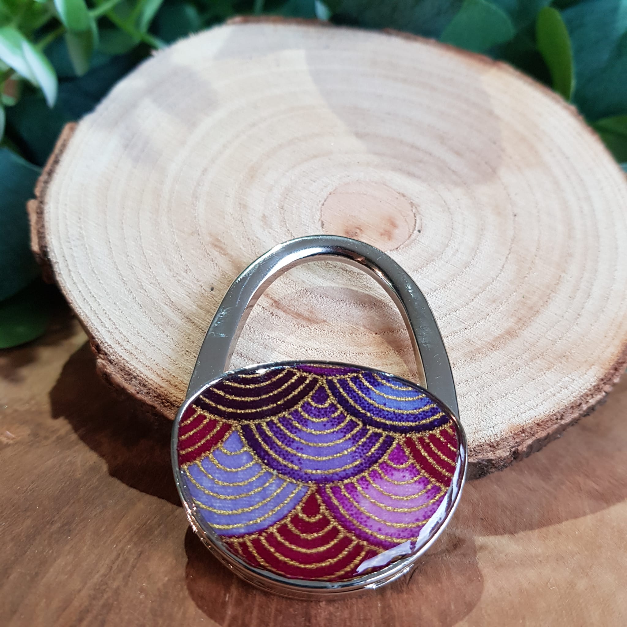accroche sac à main solide, bijou de sac, design unique, tissu japonais vitrifié, arcs violets et dorés