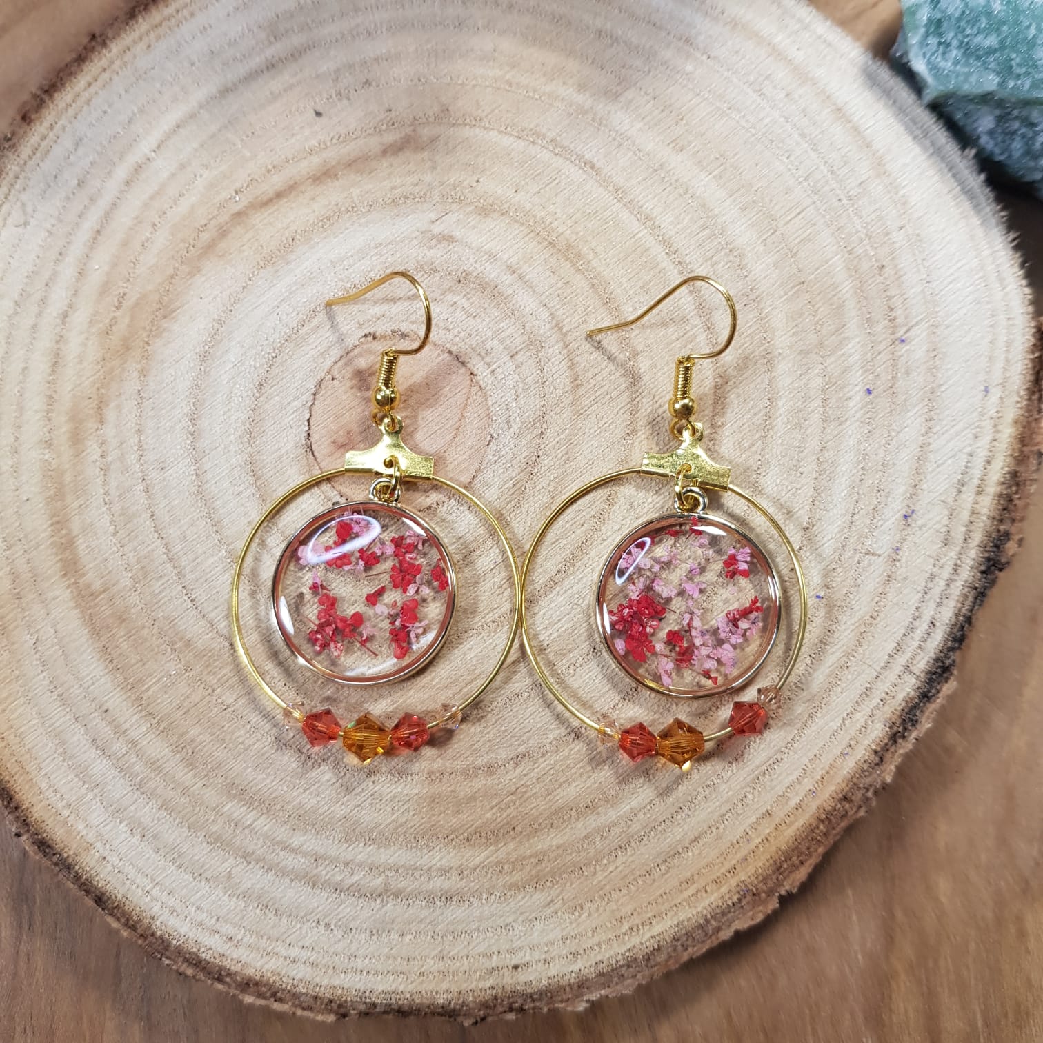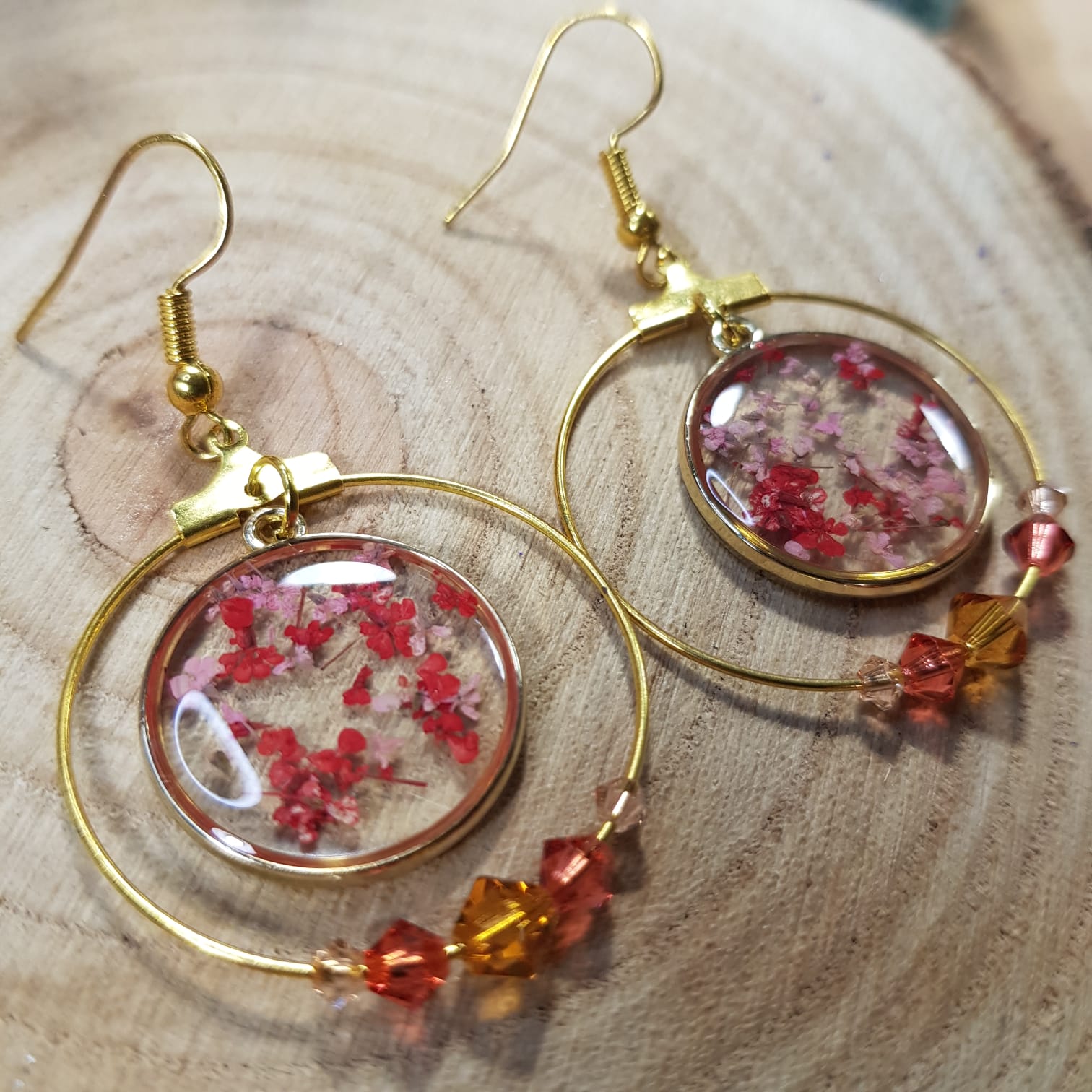 Boucles d’oreilles créoles dorées, cabochon résine et fleurs rouges, perles cristal