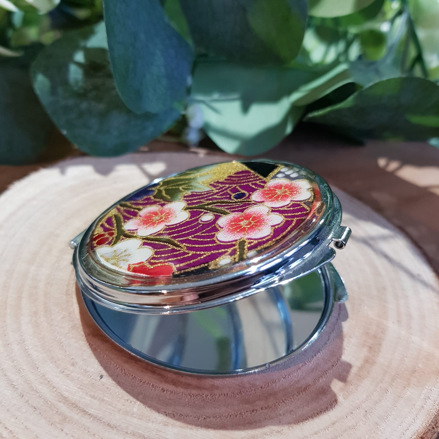 Ce miroir de sac pliable avec 2 faces intérieures est orné de tissu japonais à motifs fleuris et arcs violets. Le tissu a ensuite été vitrifié à la résine pour un rendu couleur magnifique, parfait et solide, à la façon des émaux.