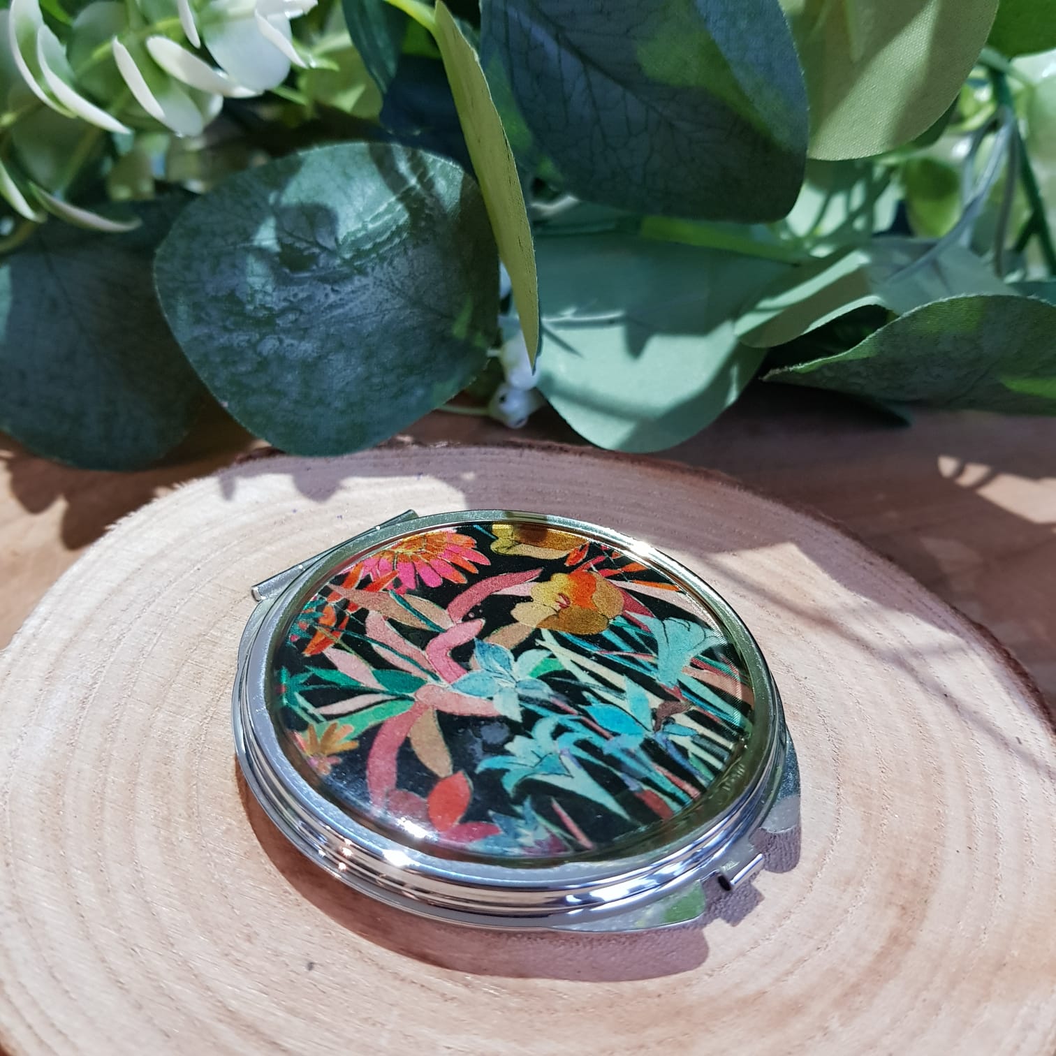 Miroir de sac, pliable, pour femme, décoré de tissu Liberty vitrifié à la résine, comme de l’émail, motifs fleurs turquoise orange. Fait main